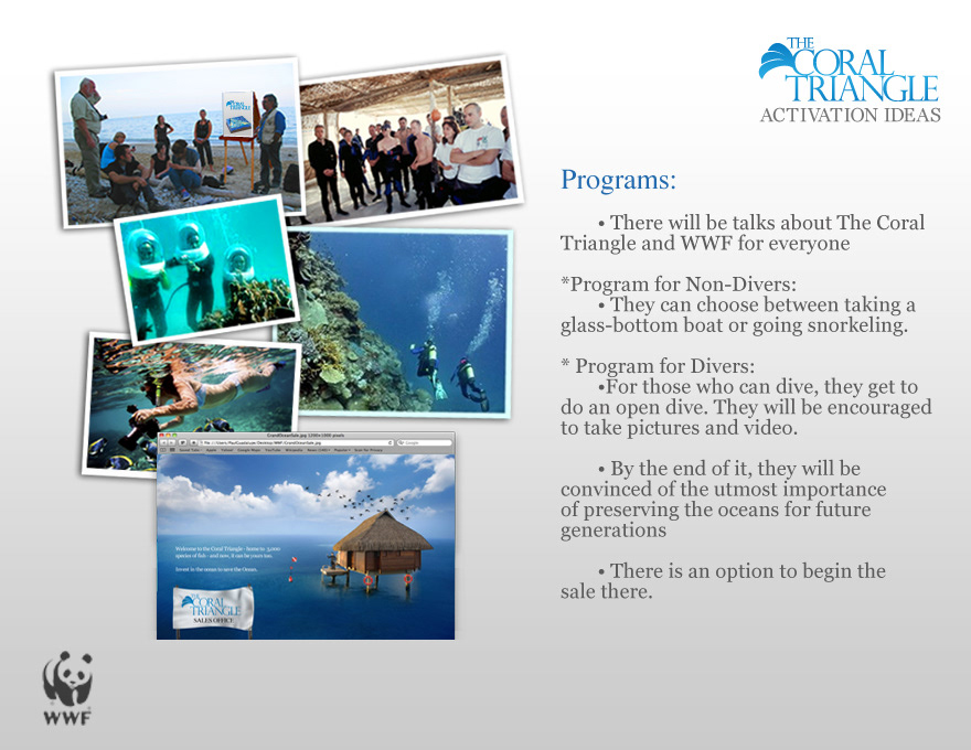 Dubbed “the nursery of the seas”, the Coral Triangle is a sanctuary to 3,000 species of marine life and sustains the livelihood of 120 million people, earning over $12 billion a year from tourism alone. However, overfishing and unsustainable urban development are causing its rapid destruction. But with your awareness and support, the Coral Triangle can still be protected and preserved. Think of it as investment that will secure the future. The planet’s future.